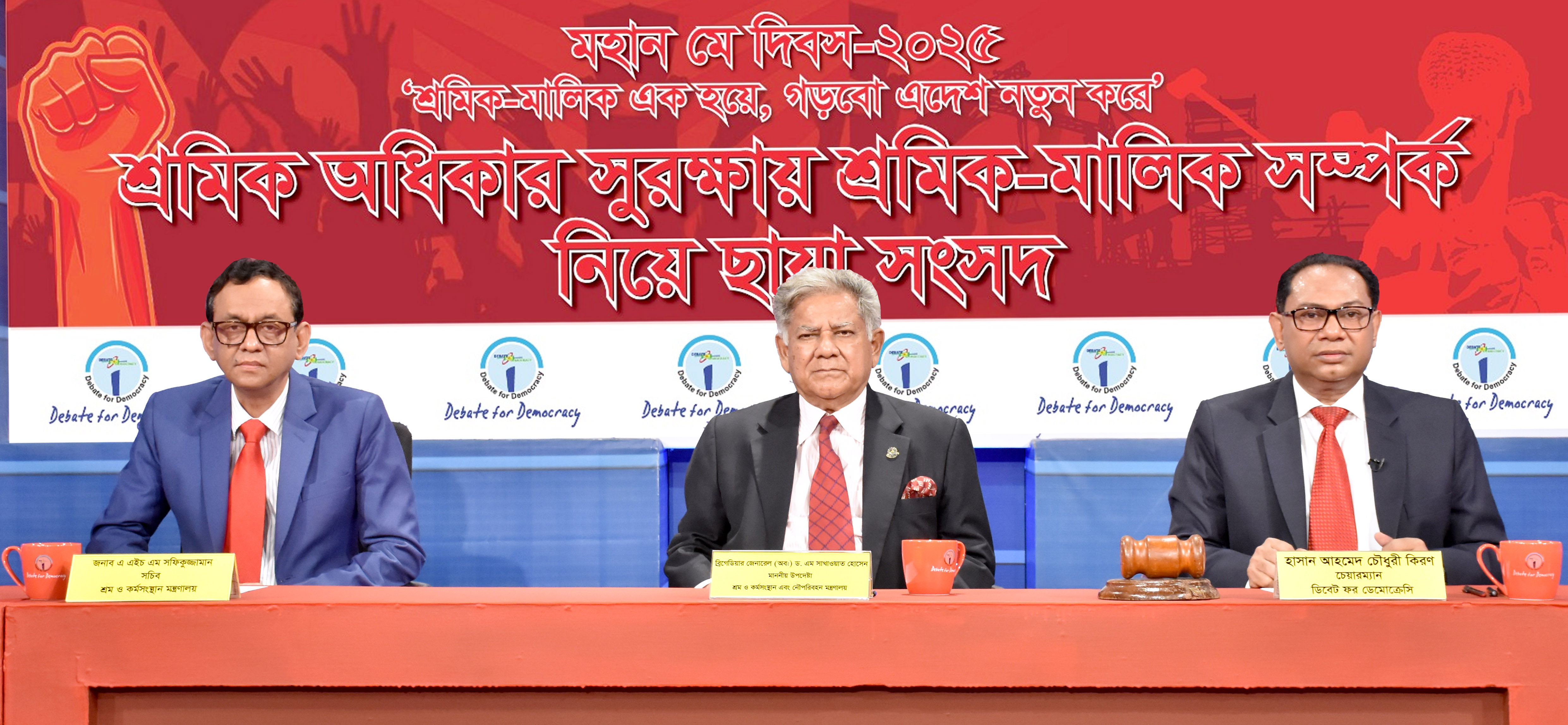 সভাপতির বক্তব্যে ডিবেট ফর ডেমোক্রেসির চেয়ারম্যান হাসান আহমেদ চৌধুরী কিরণ বলেন, মে দিবস আসে যায়। দিবসটিতে নানা র্যালী, মিছিল—শ্লোগান, সভা-সমাবেশের মাধ্যমে পালিত হয়। কিন্তু শ্রমিকের ভাগ্য বদলায় না। যাদের শ্রমে—ঘামে দেশের চাকা ঘোরে, তাদের ভাগ্যের চাকা ঘোরে না। শ্রমিক অধিকার আদায়ের যে দিবস, সে দিবস তাদের স্পর্শ করে না। দেশের ৮ কোটি শ্রমজীবী মানুষের মধ্যে ৮৫ শতাংশ শ্রমিকেরই আইনি ও সামাজিক সুরক্ষা নেই। শ্রমিক হিসেবে রাষ্ট্রীয় স্বীকৃতি নেই, নেই কর্মস্থলে পরিচয়পত্র। অথচ জুলাই অভ্যুত্থানে ছাত্র—জনতার বিপ্লবে ১১২ জন শ্রমিক ও শ্রমজীবী মানুষ শহীদ হয়েছেন। কয়েক হাজার শ্রমজীবী মানুষ আহত হয়ে হাসপাতালে কাতরাচ্ছেন। এর মধ্যে অনেকেই পঙ্গুত্ববরণ করেছেন। তাই শ্রমিক ও শ্রমজীবী মানুষের ন্যায্য দাবি পূরণ না হলে, জুলাই বিপ্লবের অর্জিত সুফল ম্লাণ হয়ে যাবে। রাজনৈতিক সদিচ্ছা ব্যতিত শ্রমিকদের ন্যায্য অধিকার নিশ্চিত করা সম্ভব নয়। শুধু মে দিবসে শ্রমিকদের সুরক্ষার কথা না বলে, শ্রমিক ও শ্রমজীবী মানুষের ন্যায্য মজুরি নিশ্চিত করার প্রতিশ্রম্নতি আগামী জাতীয় নির্বাচনের পূর্বে রাজনৈতিক দলগুলি নির্বাচনী ইশতেহারে ভালোভাবে উল্লেখ করলে তাদের ভোট বাড়বে বই কমবে না। আমরা শ্রমিকদের যৌক্তিক দাবি আদায়ের পক্ষে। তবে অযৌক্তিক দাবির মাধ্যমে বহিরাগতদের নিয়ে কারখানায় শ্রমিকদের বিক্ষোভ, ভাঙচুর, কারখানা বন্ধ করে দেওয়া, জ¦ালাও পোড়াও কোনোভাবেই আমরা সমর্থন করি না। আওয়ামী সরকারের পতনের পর কিছু দেশি—বিদেশি অপশক্তি পোশাক শিল্পসহ বিভিন্ন মিল-ফ্যাক্টরি অস্থিতিশীল করার অপচেষ্টায় লিপ্ত ছিল। এমনও দেখা গেছে, শ্রমিক আন্দোলনের নামে উস্কানিদাতা কেউই শ্রমিক বা শ্রমিক নেতা নয়। শ্রম ও কর্মসংস্থান মন্ত্রণালয়, বাংলাদেশ সেনাবাহিনী, শিল্প পুলিশ, গোয়েন্দা সংস্থাসহ সংশ্লিষ্ট সকলের সহযোগিতায় অন্তর্বর্তীকালীন সরকার অযৌক্তিক শ্রমিক আন্দোলনের নামে তথাকথিত বিশৃঙ্খলা দমন করতে সমর্থ হয়েছে। বাংলাদেশের ইতিহাসে রানা প্লাজা ট্র্যাজেডি এক বড় কালো অধ্যায়। অথচ রানা প্লাজায় নিহত ও আহত পরিবারের সাহায্যে দেশি—বিদেশিদের যে অর্থ পাওয়া গিয়েছিল তার বেশির ভাগ অংশই তৎকালীন সরকার ও তার সুবিধাভোগীরা লুটপাট করেছে।